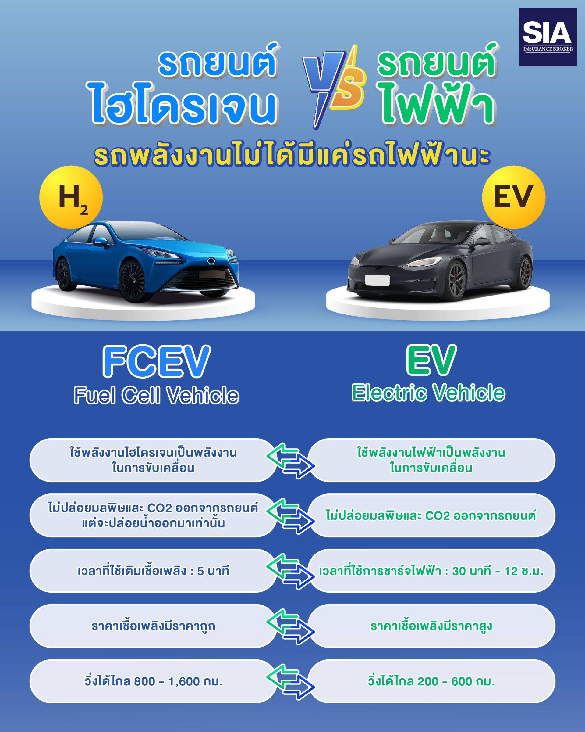 สำหรับรถไฟฟ้าหรือ EV นั้นเป็นรถที่ช่วยประหยัดเงินค่าเชื้อเพลิง เป็นมิตรกับสิ่งแวดล้อมใช้ระบบชาร์จไฟเข้าแบตเตอรี่จากที่บ้านหรือสถานีชาร์จรถยนต์ไฟฟ้า มีข้อจำกัดเรื่องระยะทาง ส่วนรถพลังงานไฮโดรเจน หรือ FCEV นั้นคือรถที่ขับเคลื่อนด้วยพลังงานไฮโดรเจนที่ถูกเปลี่ยนมาใช้ในการผลิตกระแสไฟฟ้าในการขับเคลื่อนรถยนต์ ไม่ต้องชาร์จแบตนานเพราะใช้เวลาในการเติมเชื้อเพลิงเพียง 3-5 นาทีเท่านั้น และยังมีค่าบำรุงรักษาที่น้อยอีกด้วย แต่ก็ยังไม่เป็นที่แพร่หลาย ต้องรอการพัฒนาอีกเยอะ