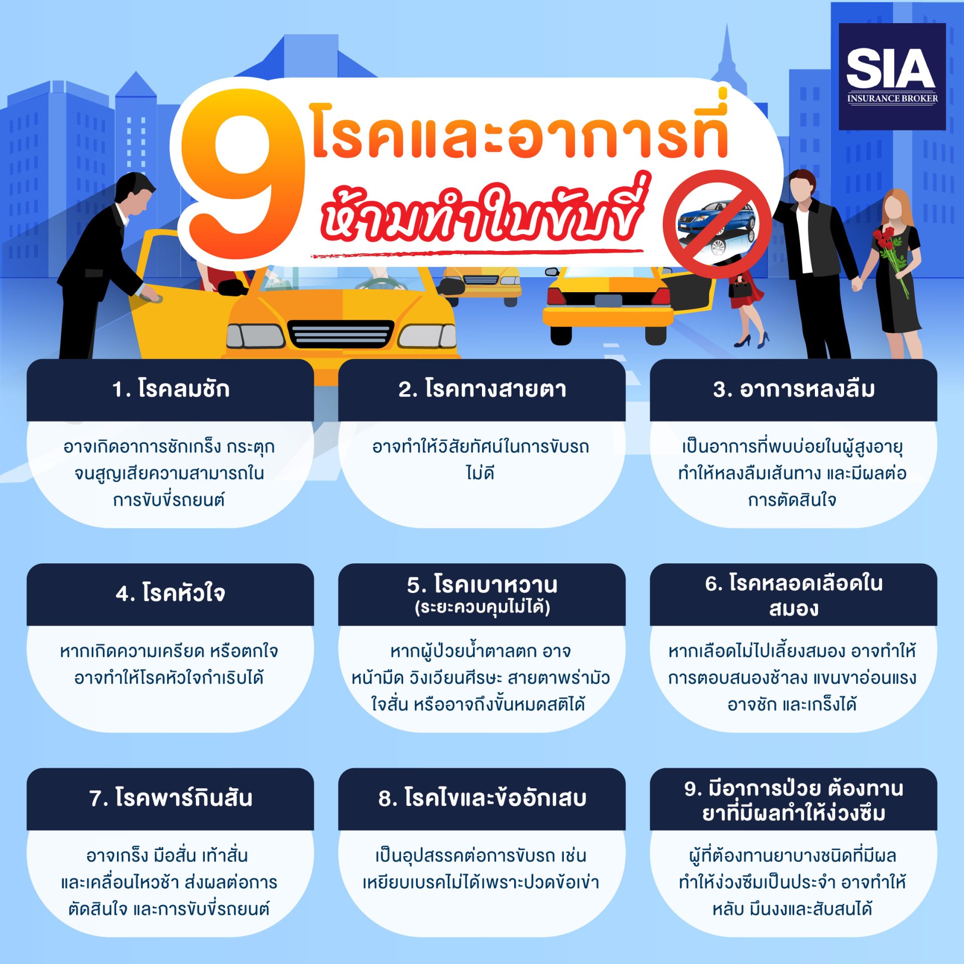 จะเห็นได้ว่า 9 โรคและอาการที่กล่าวมาข้างบนนี้สามารถก่อให้เกิดอันตรายร้ายแรงต่อผู้ใช้เส้นทางบนท้องถนนทั้งต่อตัวเราและผู้อื่น ผู้ที่มีอาการเหล่านี้ควรหลีกเลี่ยงการขับรถเพื่อความปลอดภัยของตัวเองและเพื่อนร่วมทาง และสิ่งที่สำคัญอย่าลืมทำประกันรถยนต์ ไว้เพิ่มความอุ่นใจตลอดการเดินทาง เราขอแนะนำทำประกันภัยรถยนต์กับเรา SIA Insurance Broker มีครบทุกชั้นประกันภัยรถยนต์ มีให้เลือกมากกว่า 20 บริษัทประกันภัยชั้นนำ ยินดีให้บริการตลอด 24 ชั่วโมง