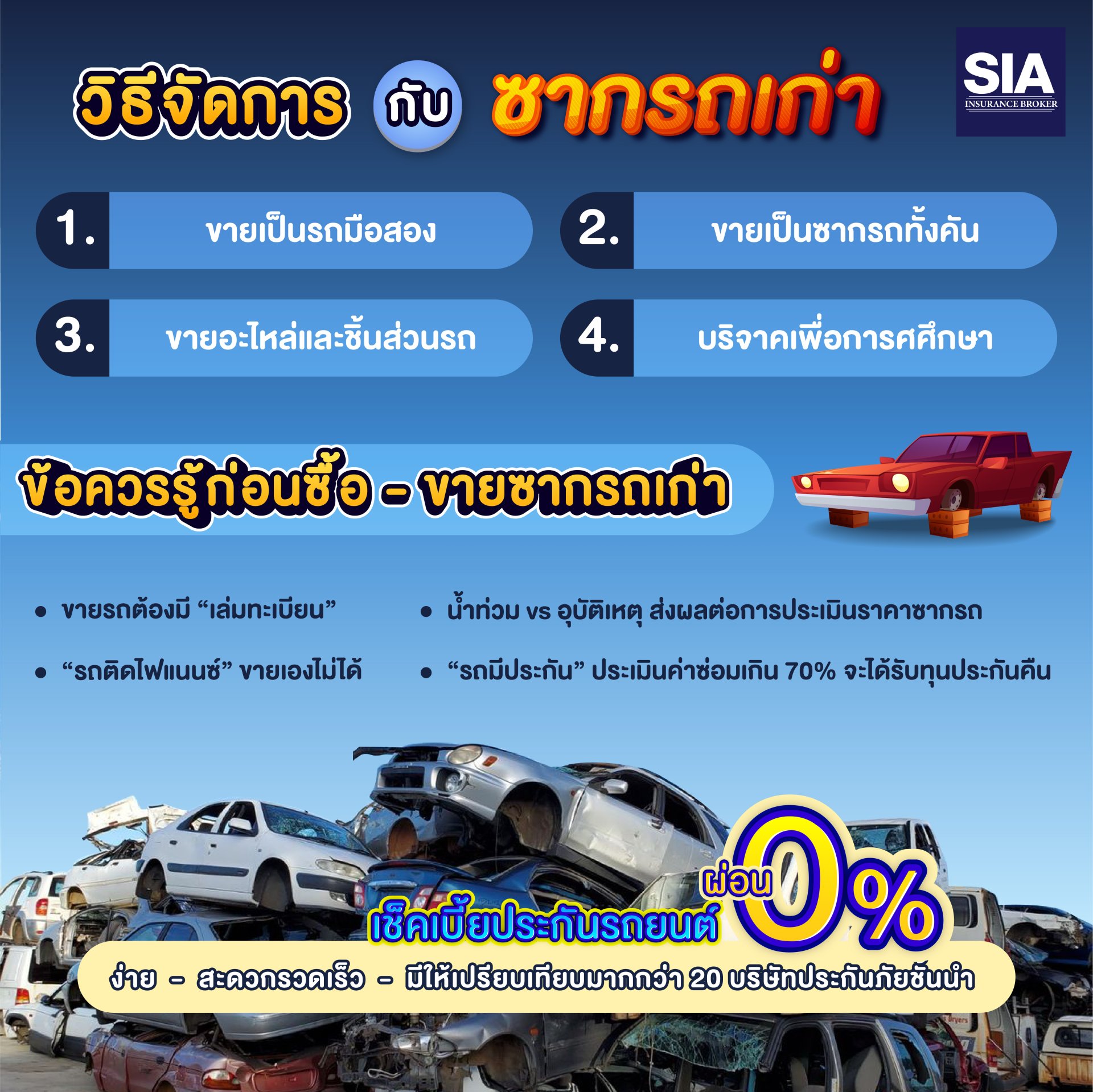 ดังนั้นก่อนที่จะขายซากรถ เราควรจะตรวจสอบรายเอียดต่างๆ เช่น เล่มทะเบียน , ภาษี และประกันรถยนต์ให้เรียบร้อยเสียก่อน เพื่อไม่ให้เกิดปัญหาในภายหลัง แต่ถ้าหากรถของเพื่อนๆ ยังสามารถได้ดีอยู่ แต่ไม่ได้นำไปขับใช้ สามารถเข้ามาดูประกันภัยเพิ่มเติมได้กับเรา SIA Insurance Broker เพื่อป้องกันและคุ้มครองความปลอดภัยของรถคุณในกรณีเกิดอุบัติเหตุไม่คาดฝัน