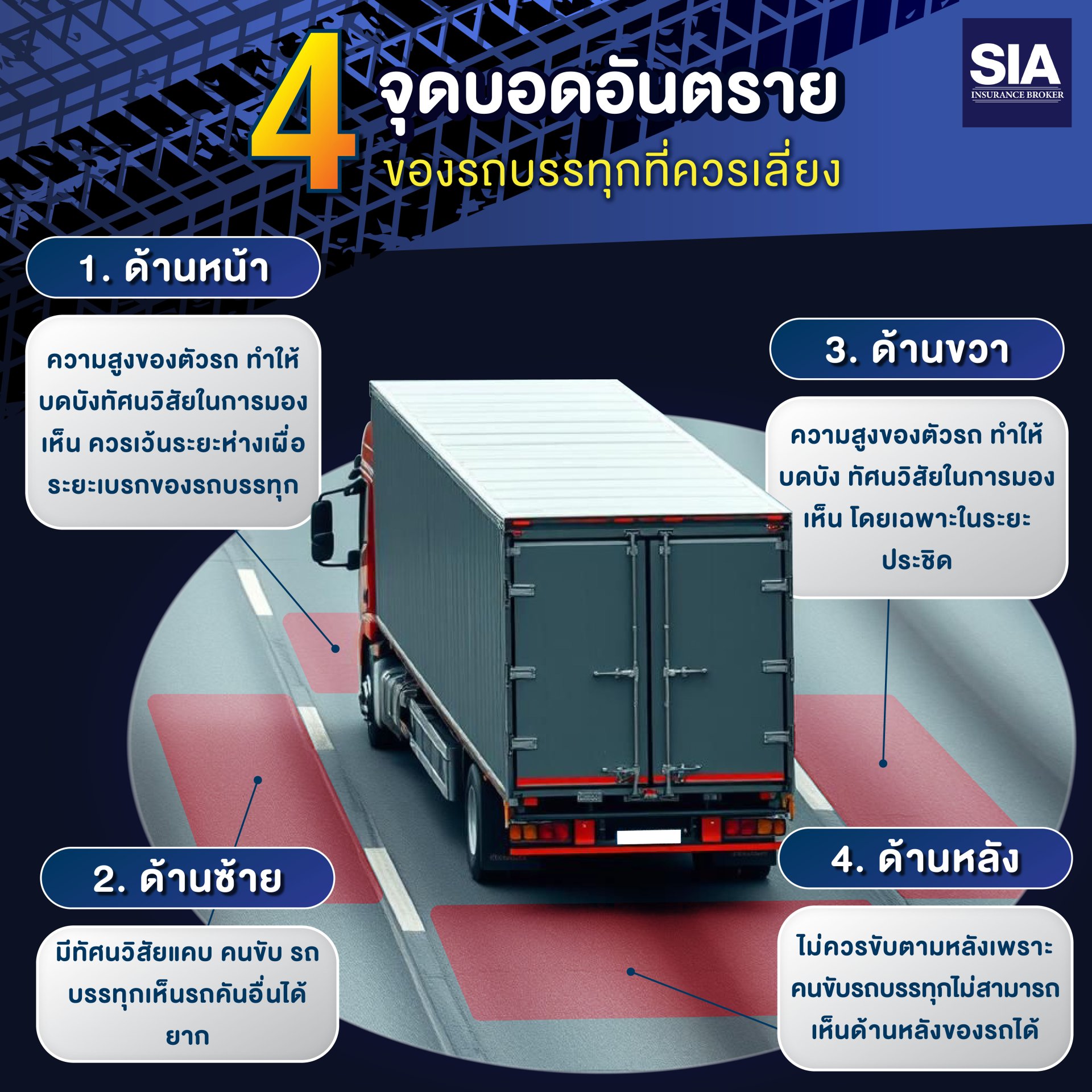 เพื่อความปลอดภัย เราควรหลีกเลี่ยงการเข้าไปอยู่ใกล้ 4 จุดบอดหลักของรถบรรทุก ดังนี้
